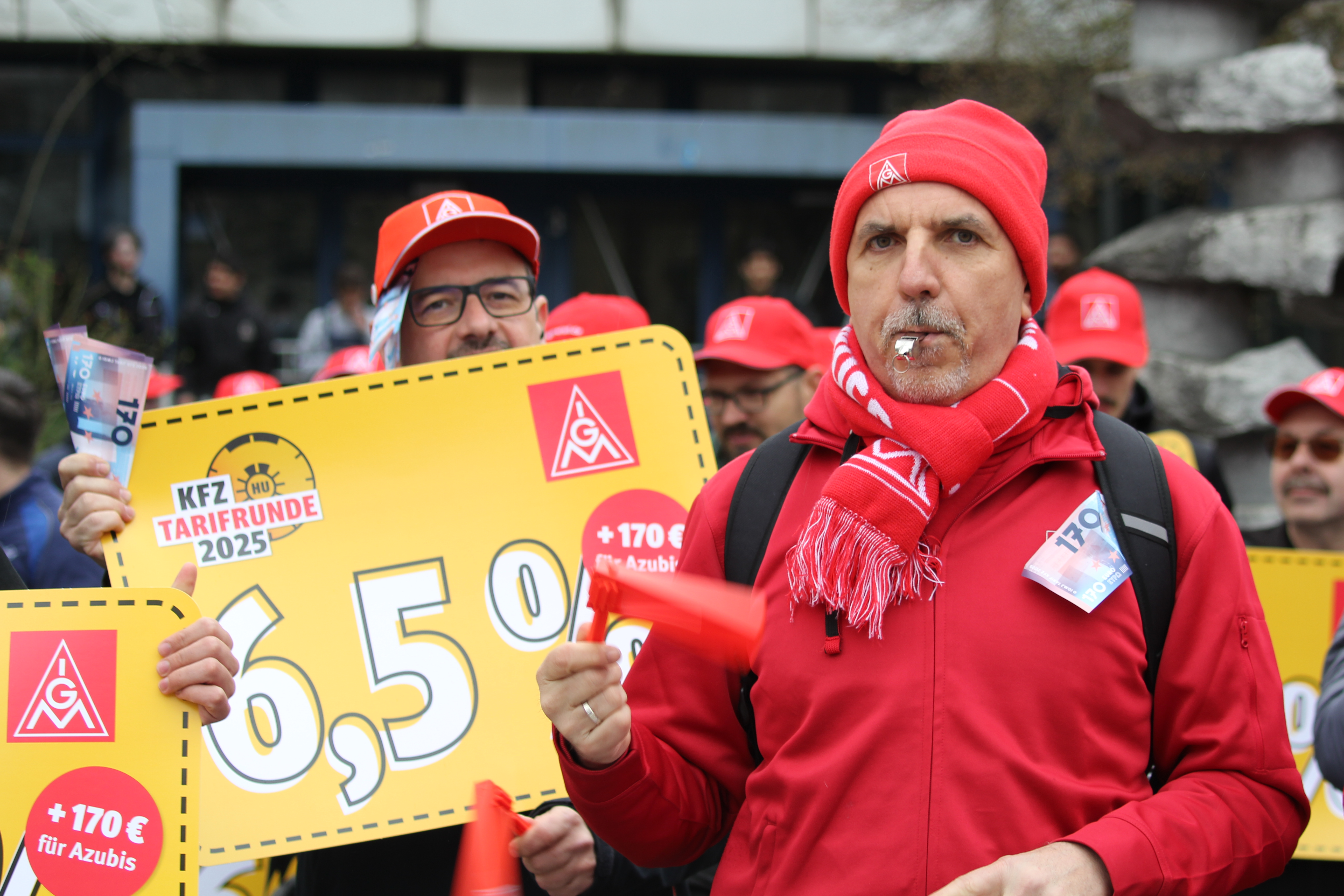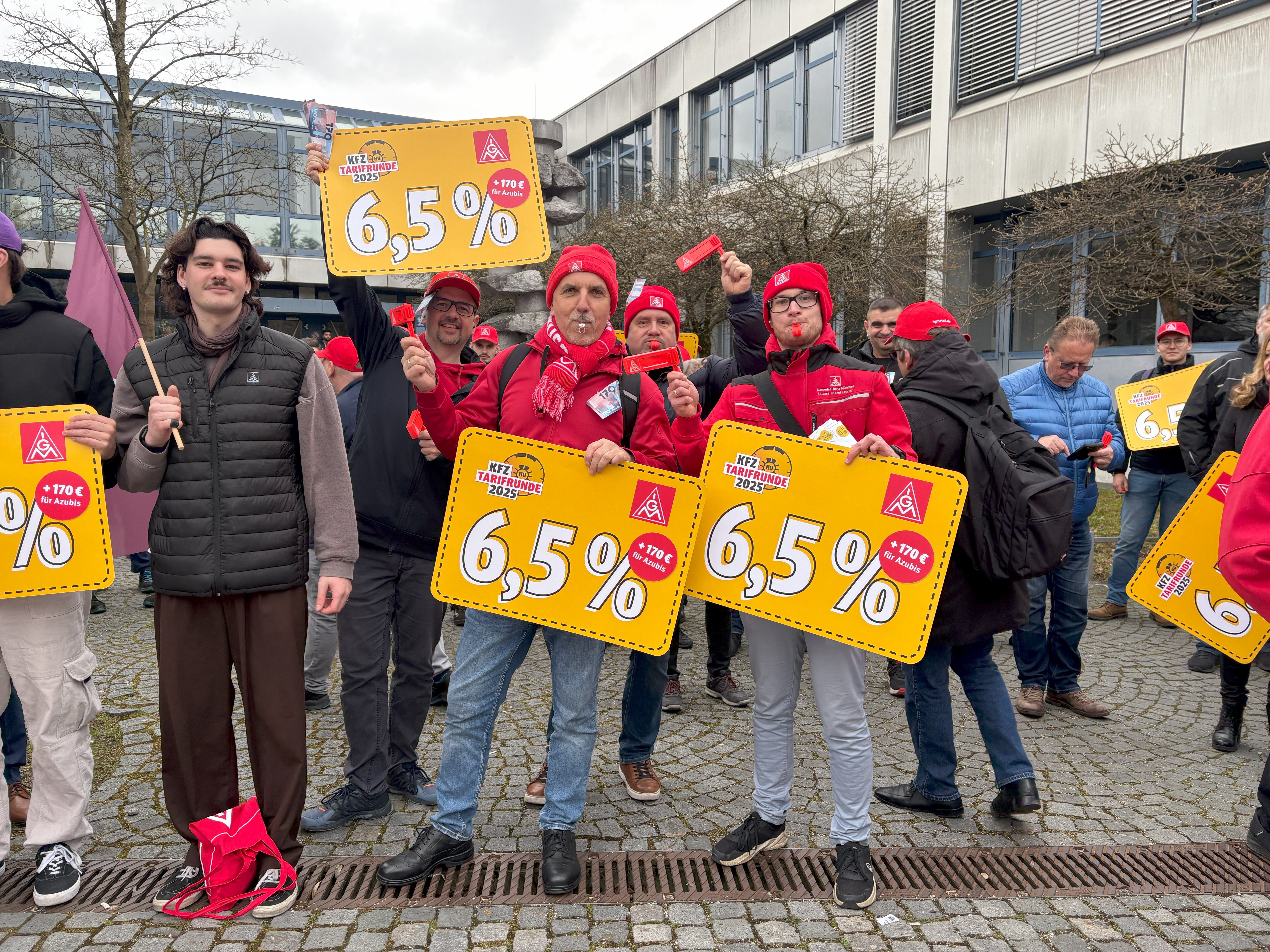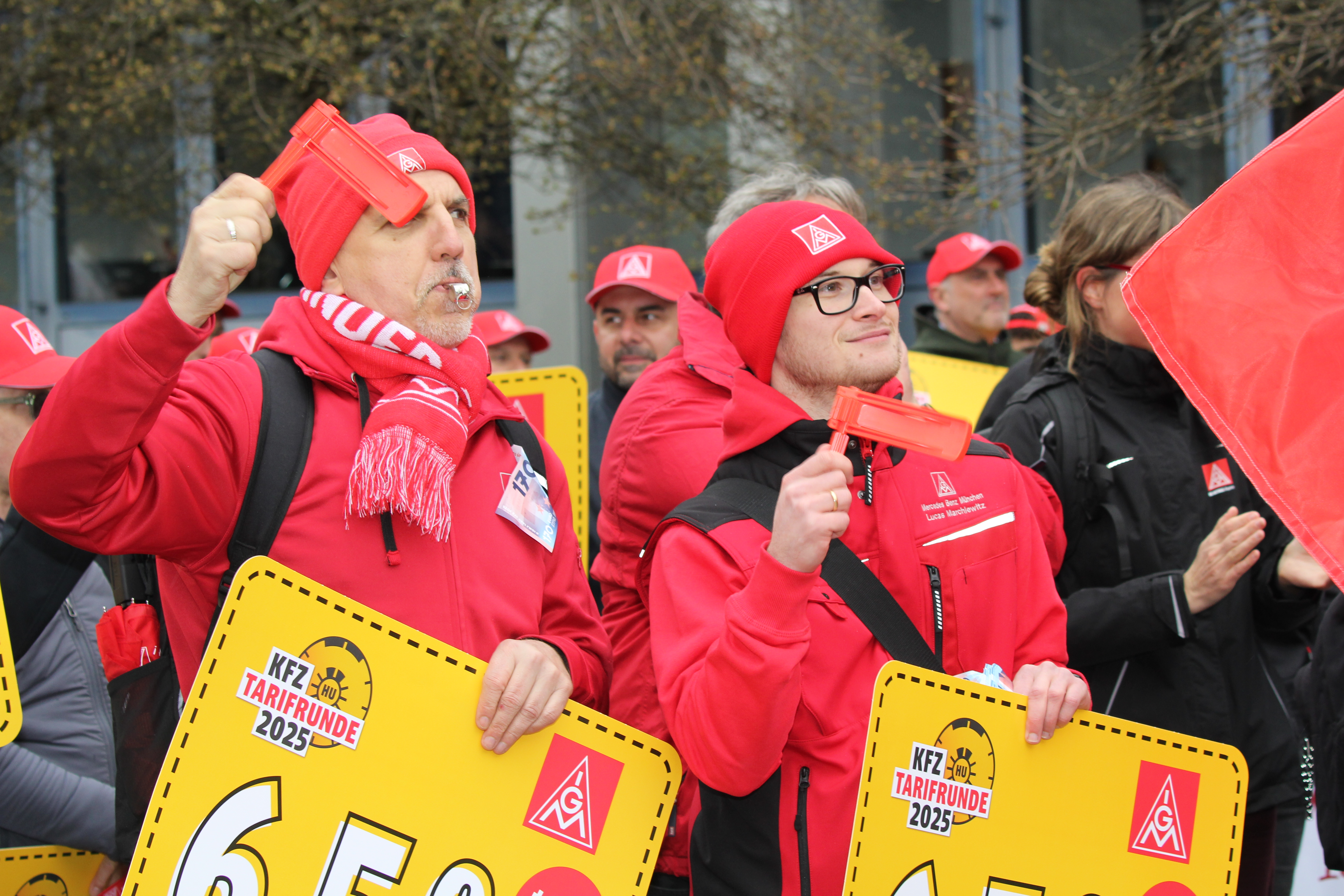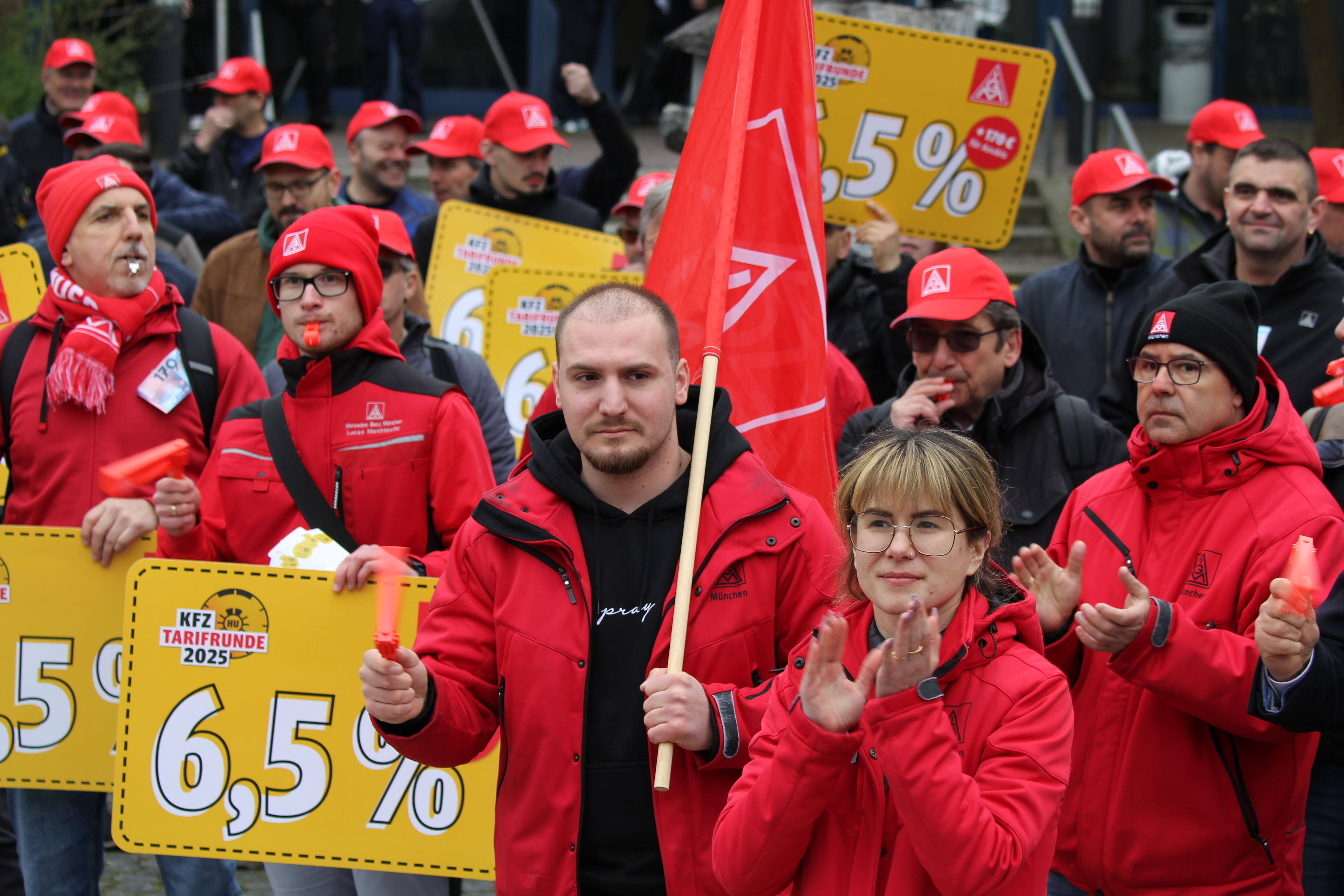 Über 200 Beschäftigte des KFZ-Handwerks haben unmittelbar vor der ersten Tarifverhandlung vor dem Verhandlungslokal für höhere Entgelte und mehr Entlastung demonstriert. Beteiligt haben sich Beschäftigte aus allen großen Münchner Autohäusern und darüber hinaus.