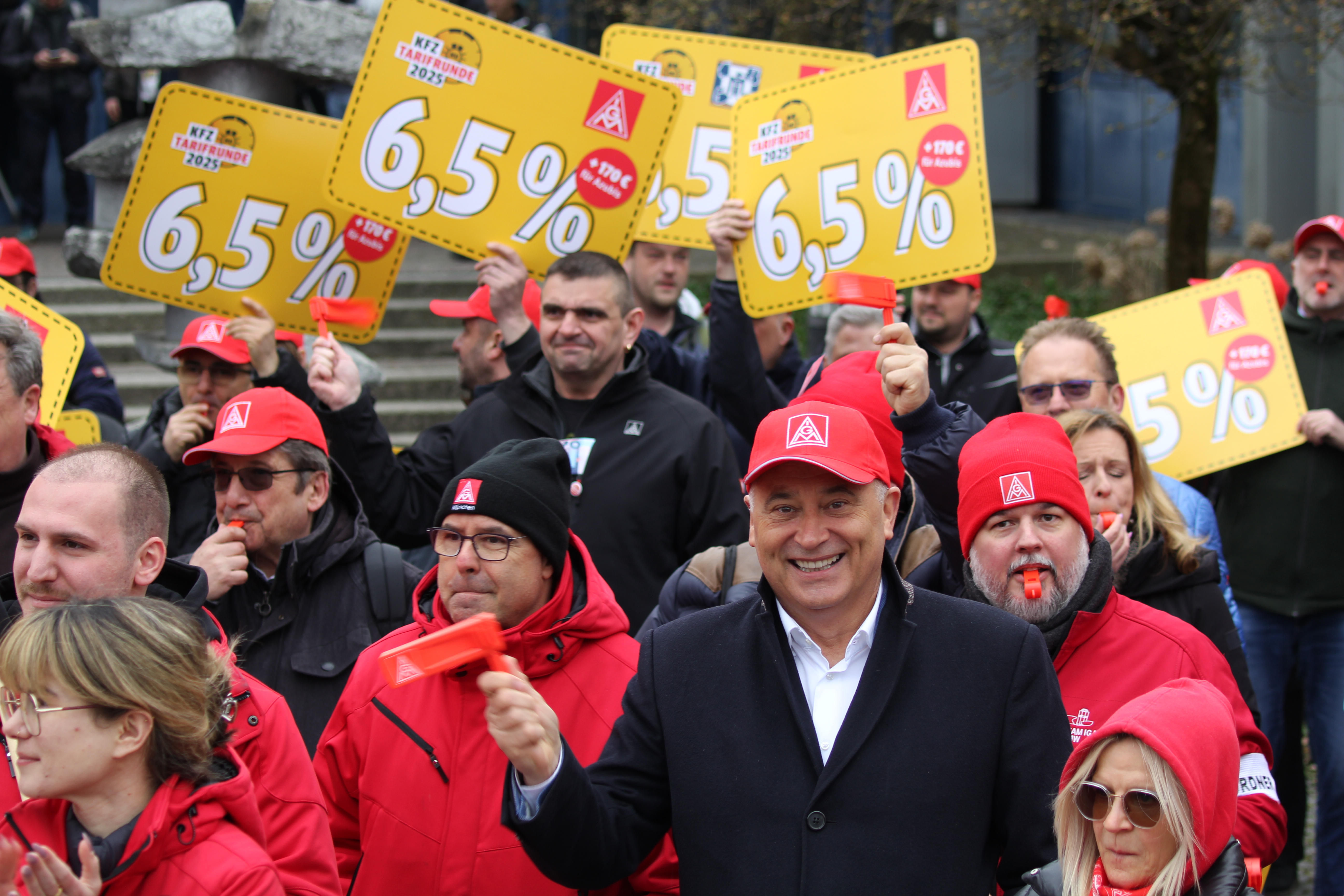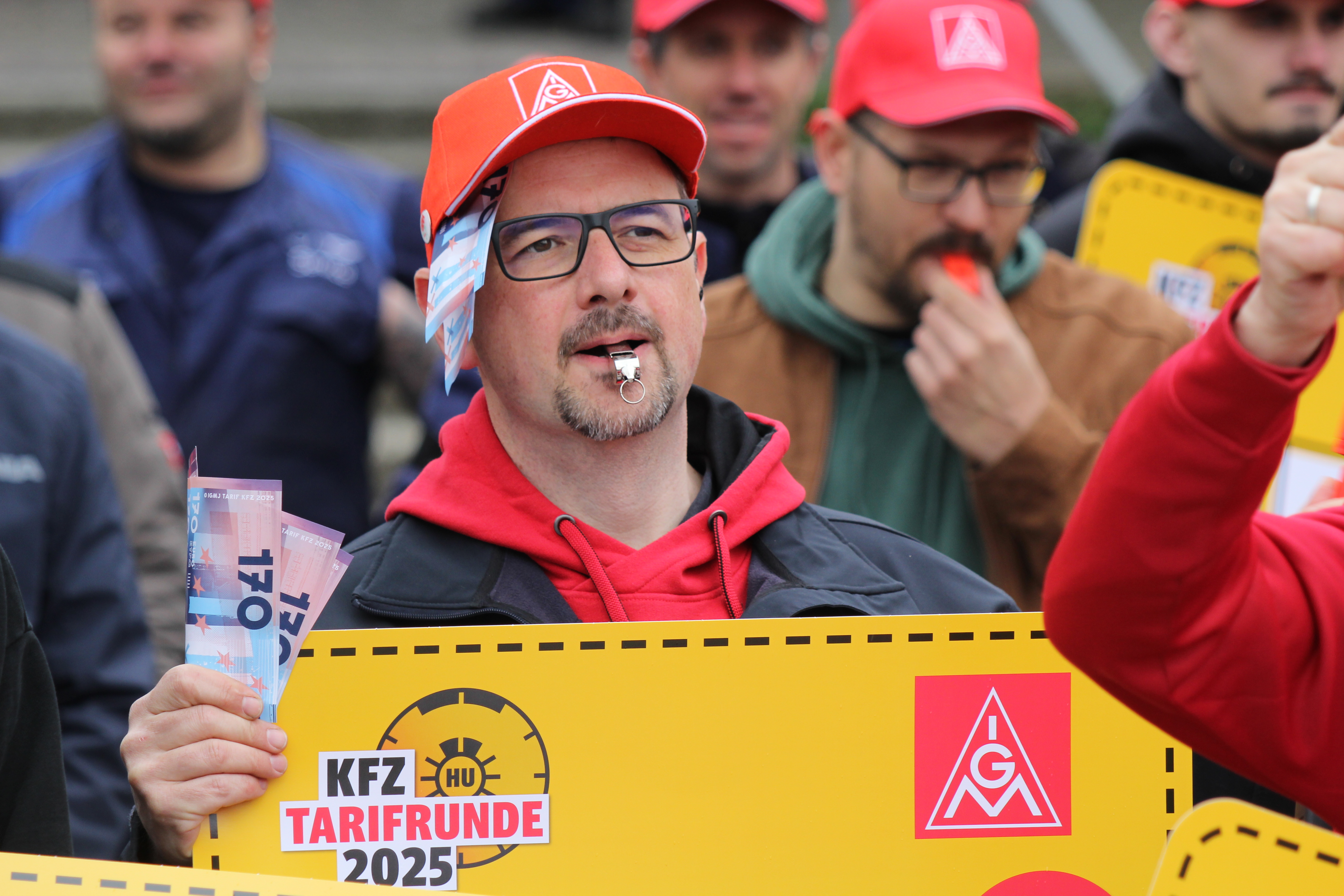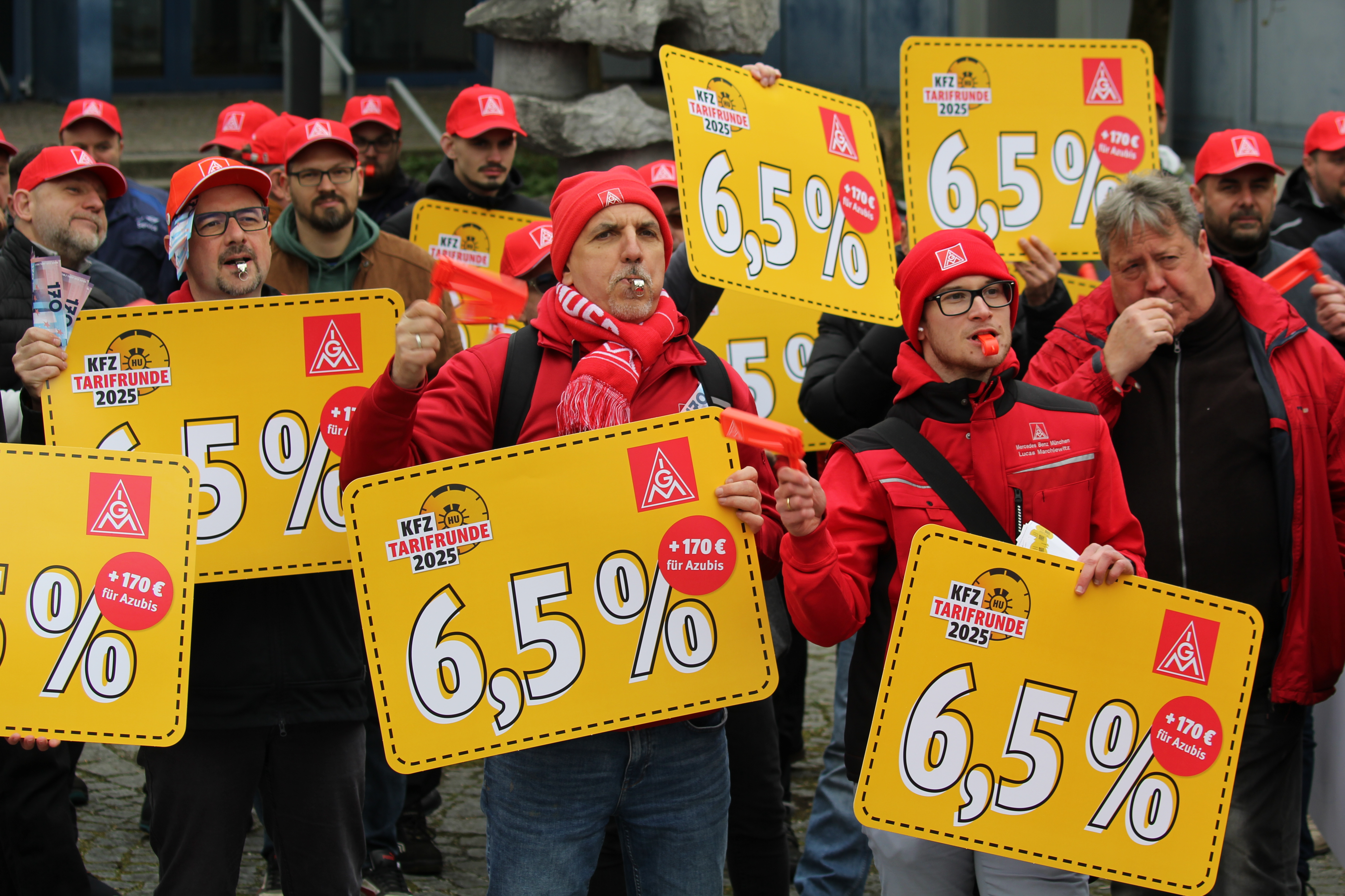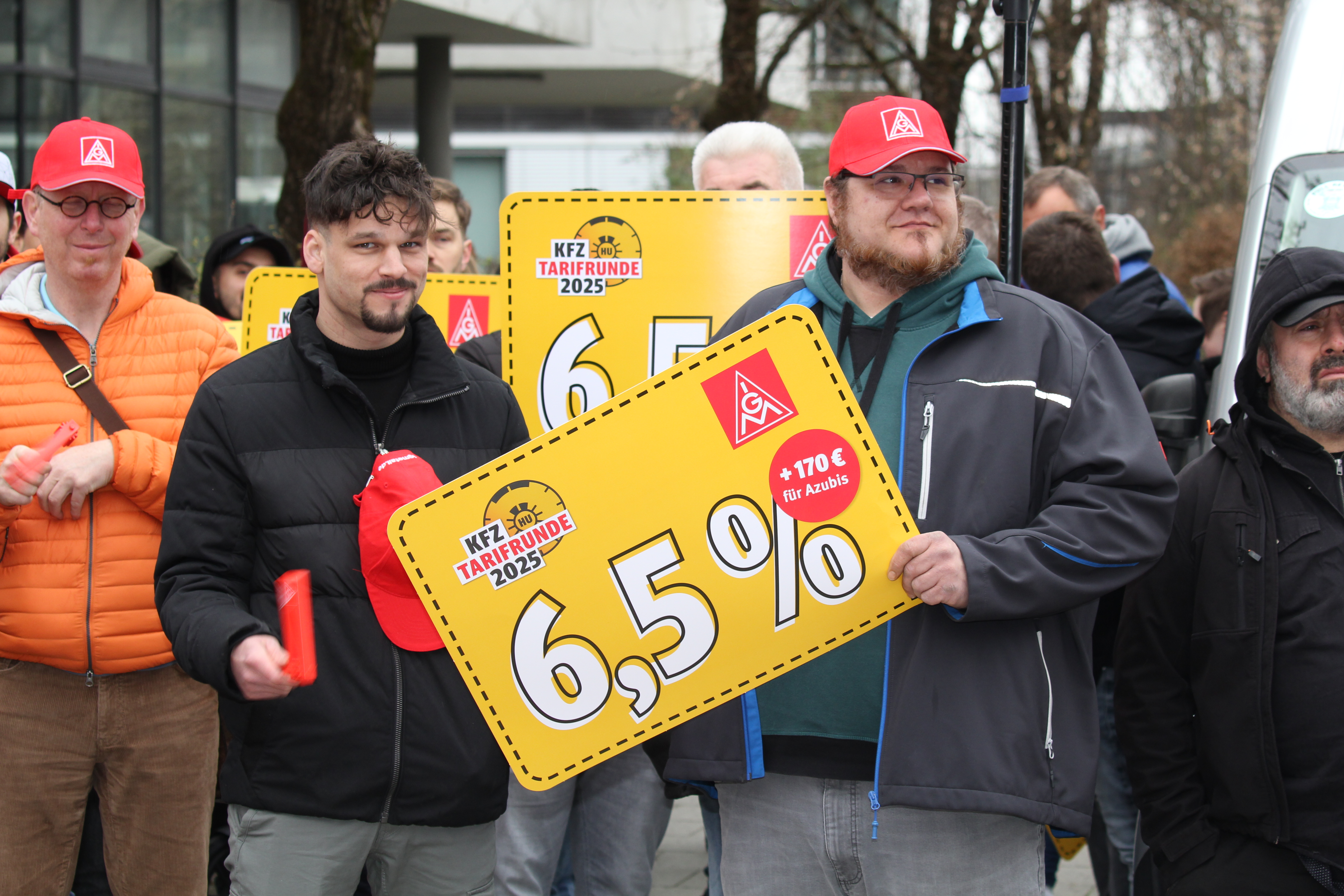 Über 200 Beschäftigte des KFZ-Handwerks haben unmittelbar vor der ersten Tarifverhandlung vor dem Verhandlungslokal für höhere Entgelte und mehr Entlastung demonstriert. Beteiligt haben sich Beschäftigte aus allen großen Münchner Autohäusern und darüber hinaus.
