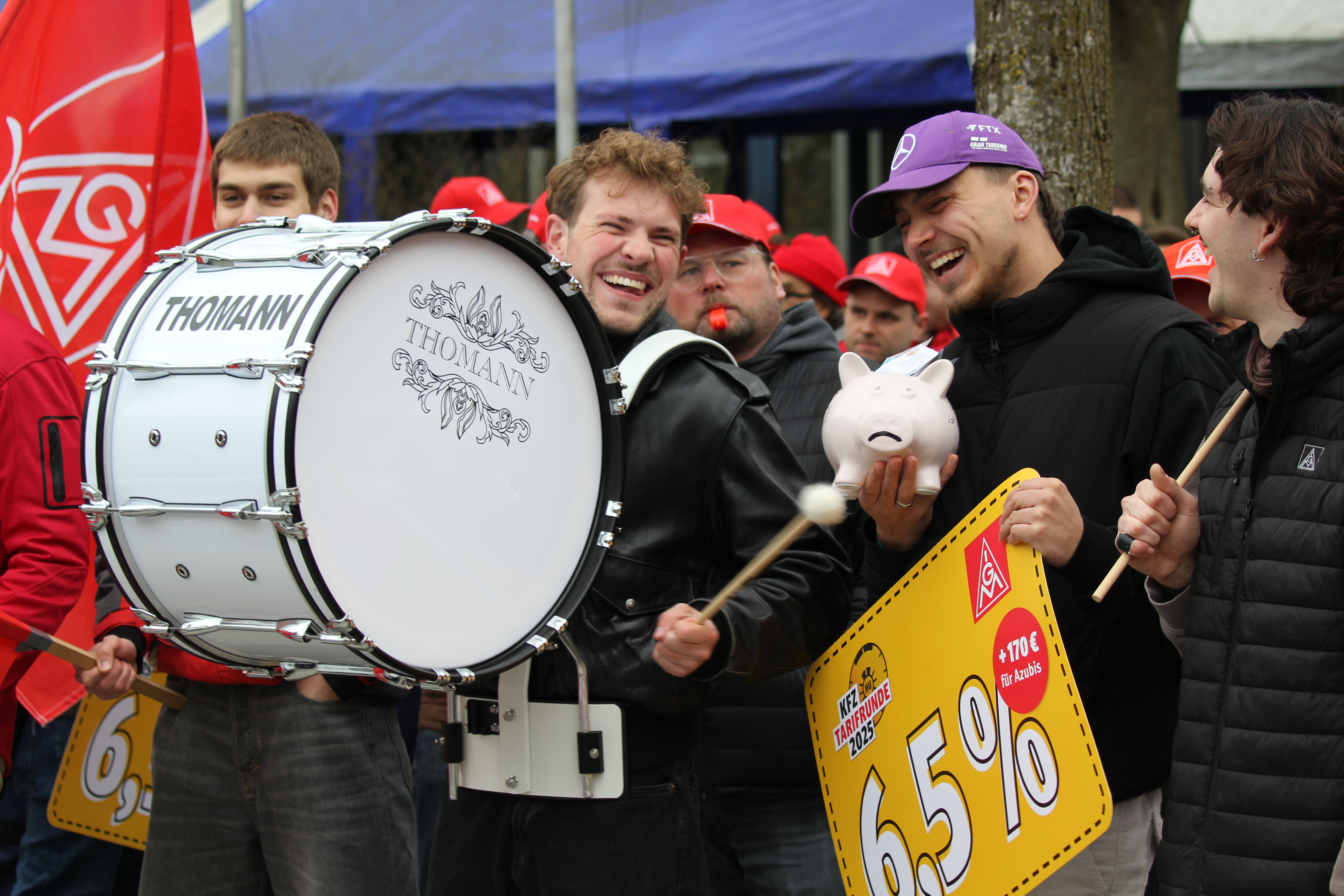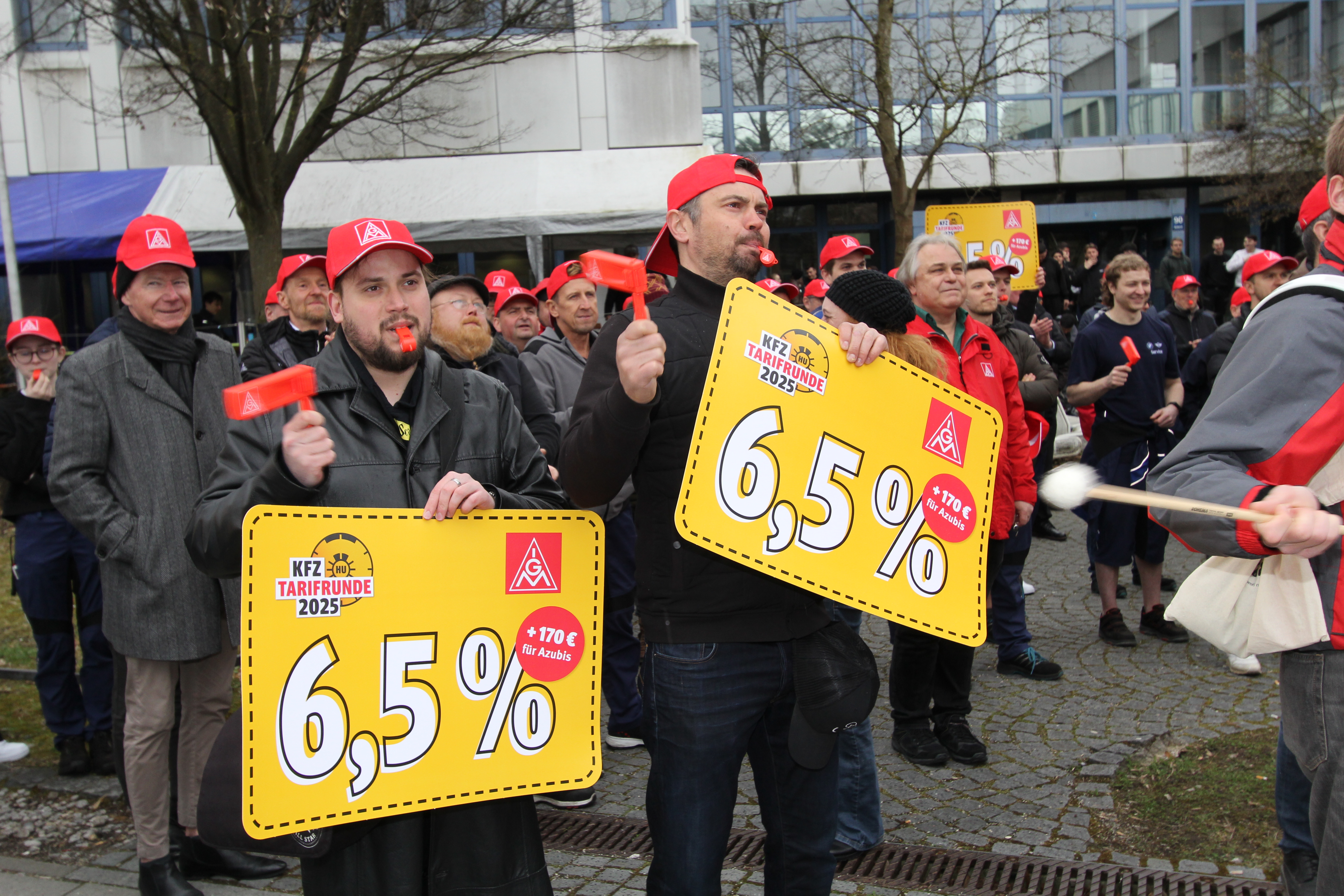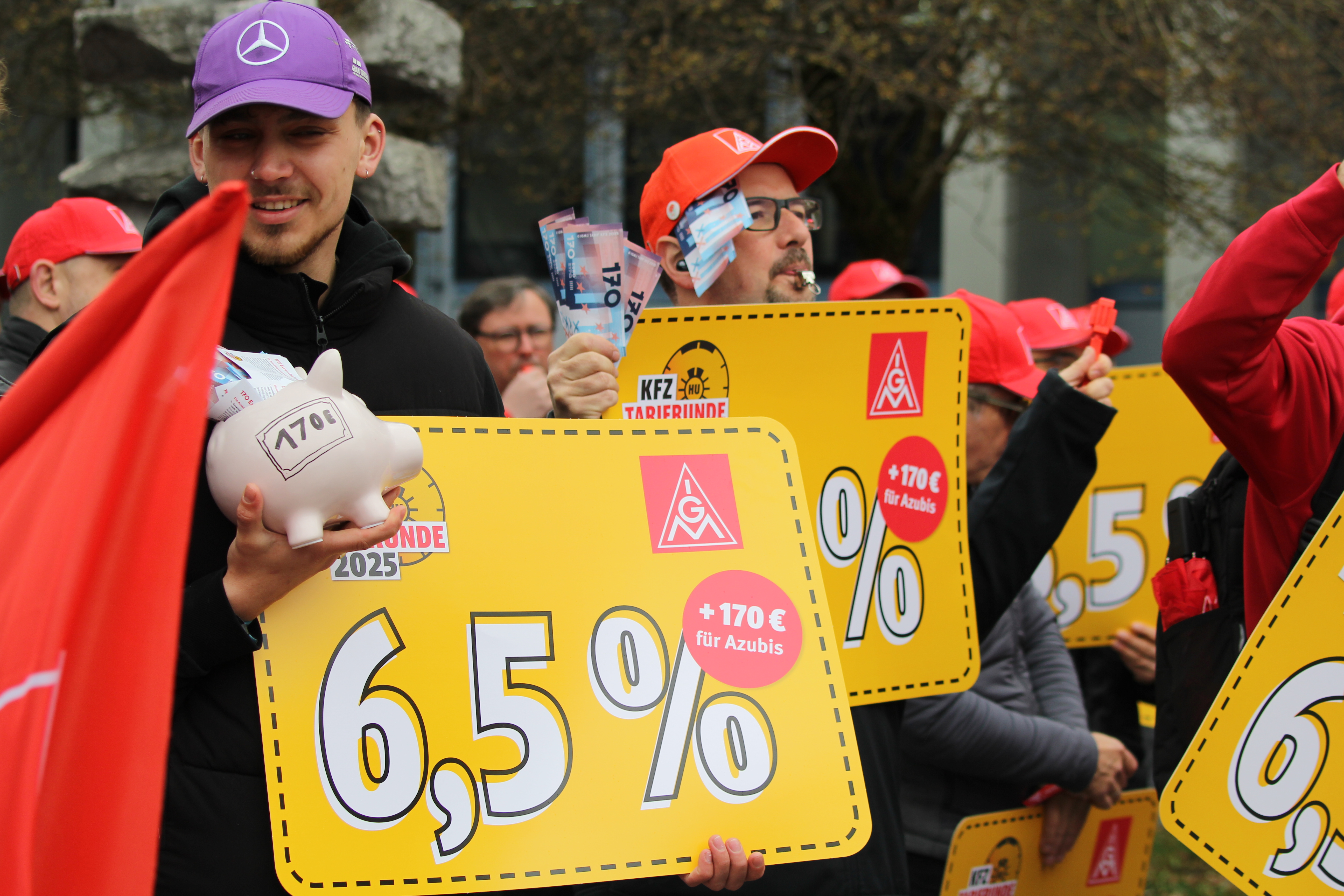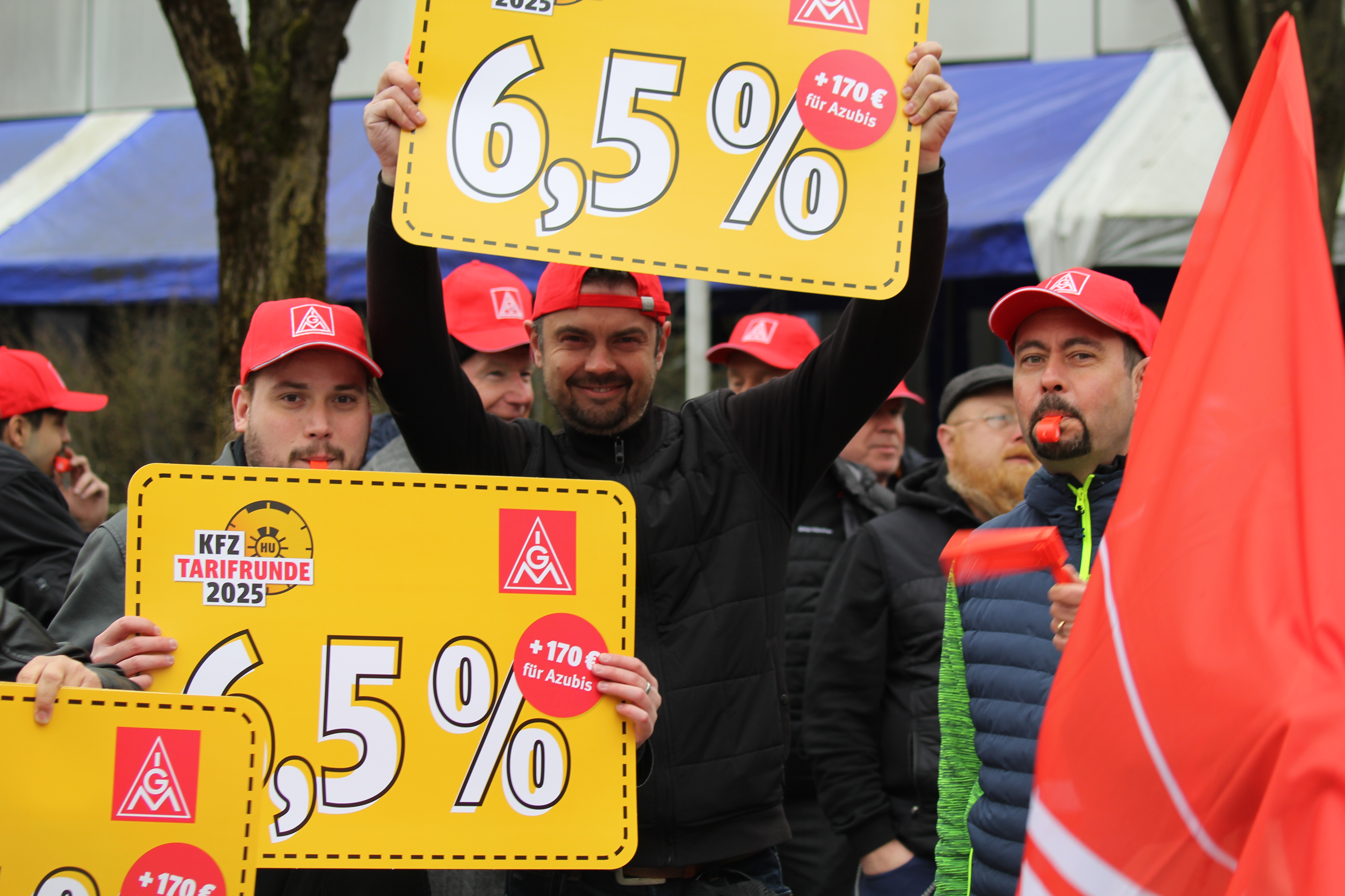 Über 200 Beschäftigte des KFZ-Handwerks haben unmittelbar vor der ersten Tarifverhandlung vor dem Verhandlungslokal für höhere Entgelte und mehr Entlastung demonstriert. Beteiligt haben sich Beschäftigte aus allen großen Münchner Autohäusern und darüber hinaus.