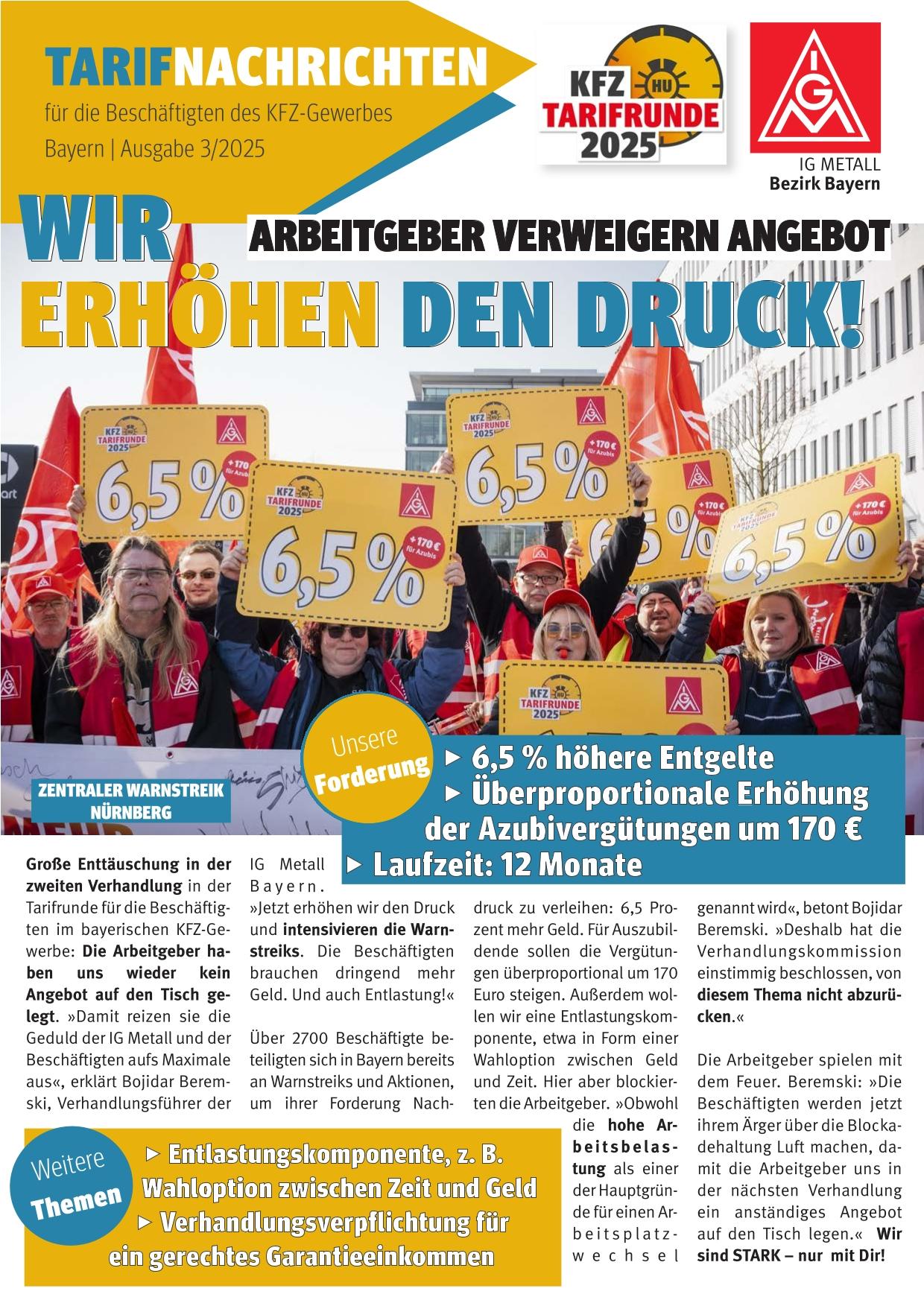 Große Enttäuschung in der zweiten Verhandlung in der Tarifrunde für die Beschäftigten im bayerischen KFZ-Gewerbe: Die Arbeitgeber haben uns wieder kein Angebot auf den Tisch gelegt. »Damit reizen sie die Geduld der IG Metall und der Beschäftigten aufs Maximale aus«, erklärt Bojidar Beremski, Verhandlungsführer der IG Metall Bayern. »Jetzt erhöhen wir den Druck und intensivieren die Warnstreiks. Die Beschäftigten brauchen dringend mehr Geld. Und auch Entlastung!«