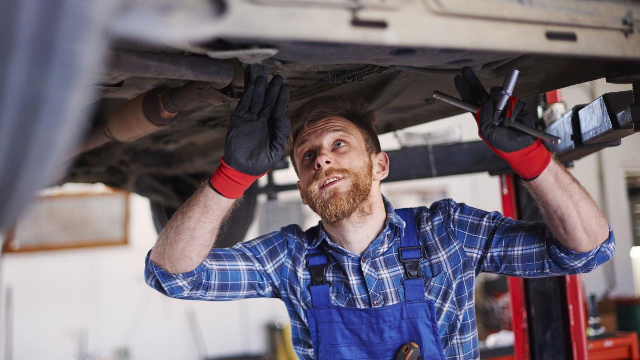 Eine Kfz-Mechanikerin und ein Mechaniker vor einem Auto