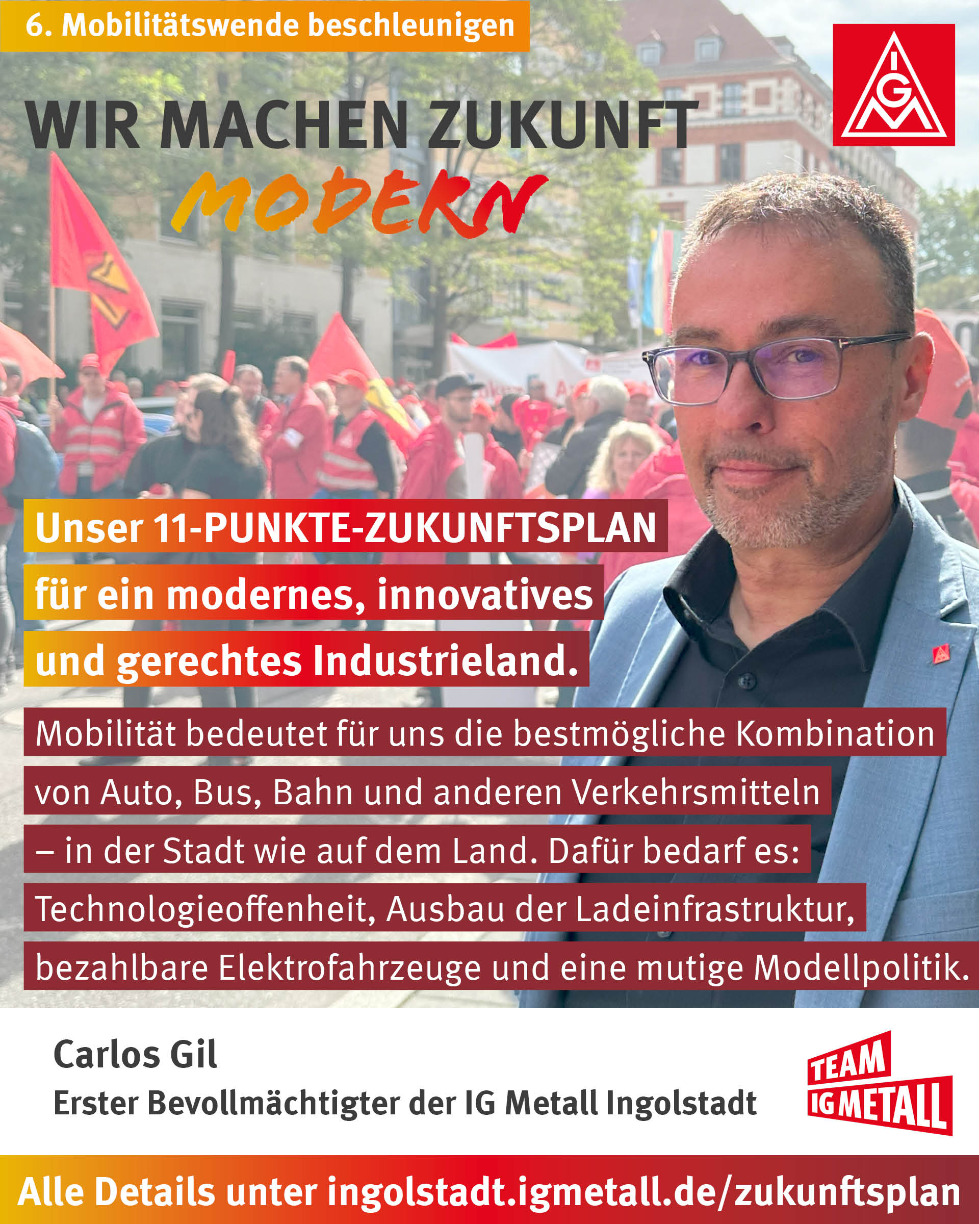 Mobilität bedeutet für uns die bestmögliche Kombination von Auto, Bus, Bahn und anderen Verkehrsmitteln - in der Stadt wie auf dem Land. Dafür bedarf es: Technologieoffenheit, Ausbau der Ladeinfrastruktur, bezahlbare Elektrofahrzeuge und eine mutige Modellpolitik.