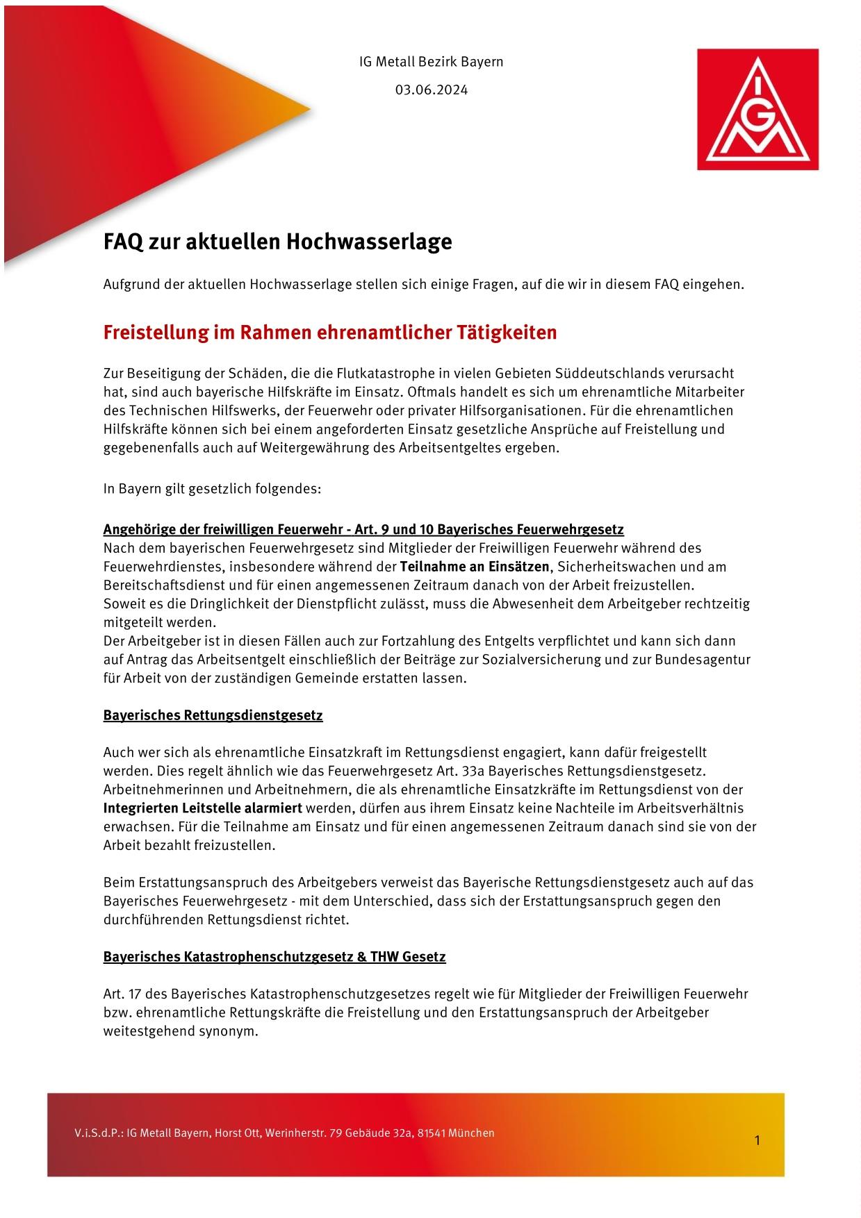Zur Beseitigung der Schäden, die die Flutkatastrophe in vielen Gebieten Süddeutschlands verursacht hat, sind auch bayerische Hilfskräfte im Einsatz. Oftmals handelt es sich um ehrenamtliche Mitarbeiter des Technischen Hilfswerks, der Feuerwehr oder privater Hilfsorganisationen. Für die ehrenamtlichen Hilfskräfte können sich bei einem angeforderten Einsatz gesetzliche Ansprüche auf Freistellung und gegebenenfalls auch auf Weitergewährung des Arbeitsentgeltes ergeben.